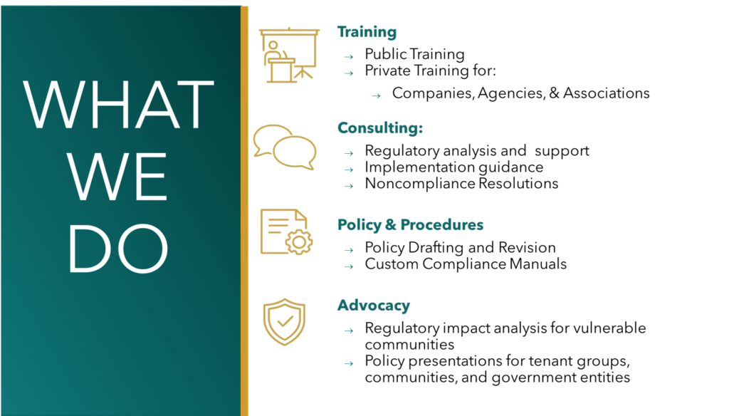 We offer regularly scheduled training programs open to the public, designed for compliance professionals, property managers, agency staff, and housing leaders seeking in-depth, actionable instruction.